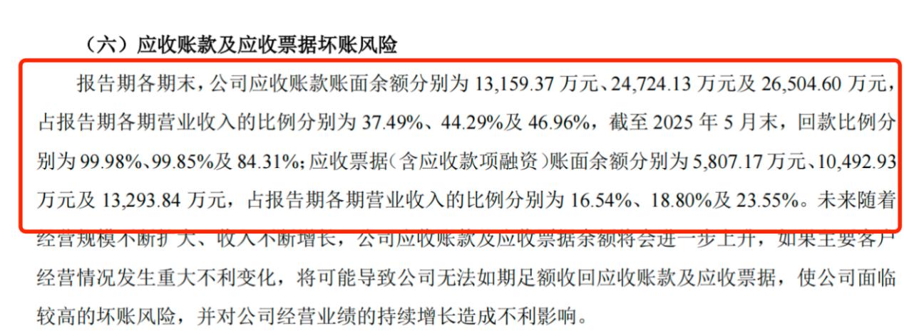 财务风险方面,公司应收账款及应收票据规模持续攀升。报告期各期末,应收账款余额分别为1.32亿元、2.47亿元及2.65亿元,占营收比例分别为37.49%、44.29%及46.96%。尽管历史回款情况良好,但随着经营规模扩大,若主要客户经营恶化,公司将面临坏账风险。