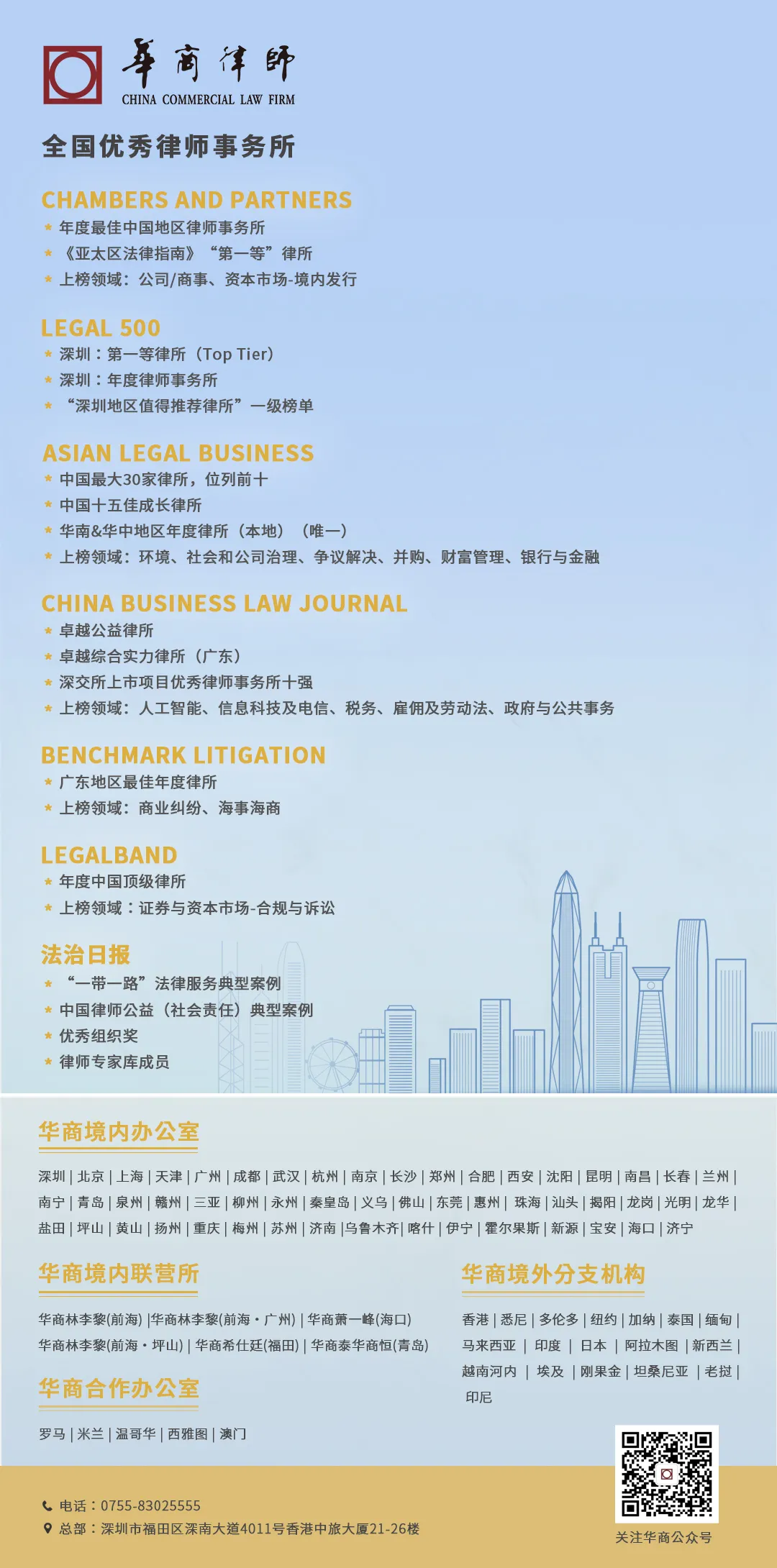 华商作为国内最具规模的综合性律师事务所之一。始终聚焦新兴行业发展趋势,搭建专业化法律服务体系,提供具有本土优势、行业优势和国际视野的法律服务。此次6位律师集体上榜,既是对律师个人专业能力的高度肯定,也是对华商在新兴行业法律服务领域实力的有力印证。