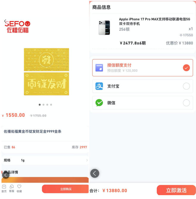 仪花卡商城目前在售的有黄金、手机、平板电脑、游戏机、高端护肤品等多类商品。其中,佐禧佑福黄金币锭发财足金9999金条1g规格的商品售价为1550元。在佐禧佑福天猫旗舰店,记者看到了同款同规格商品,售价为1150元。由此计算,其溢价达34.78%。