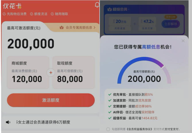记者注意到,仪花卡App中也存在收取会员费的情况。在App首页记者看到有一个“会员专属高额低息”的按钮,点击后跳转到了一个“超级会员权益服务”的产品页面,显示开通后可获得优先审批、加速放款、定期提额等服务,该权益卡售价为199元。