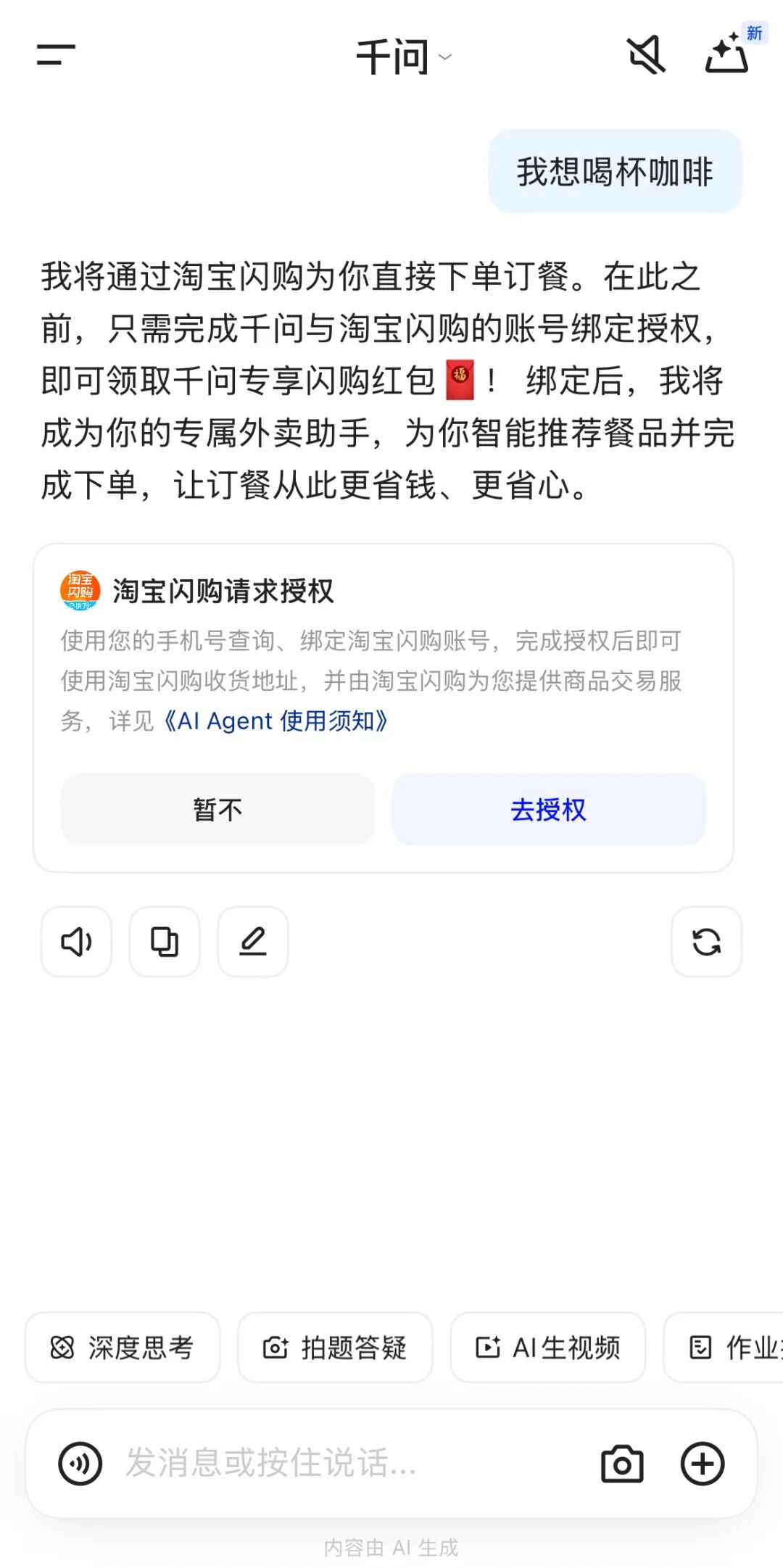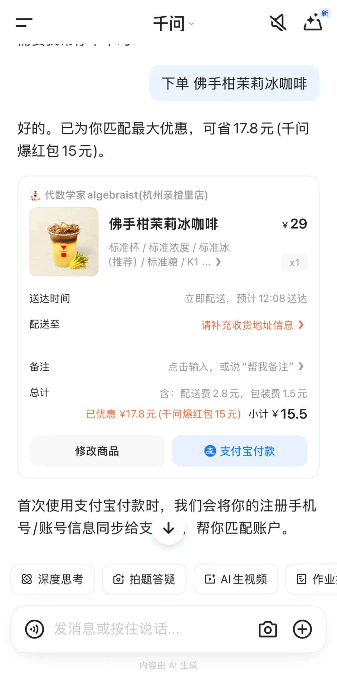 体验在千问里丝滑点外卖