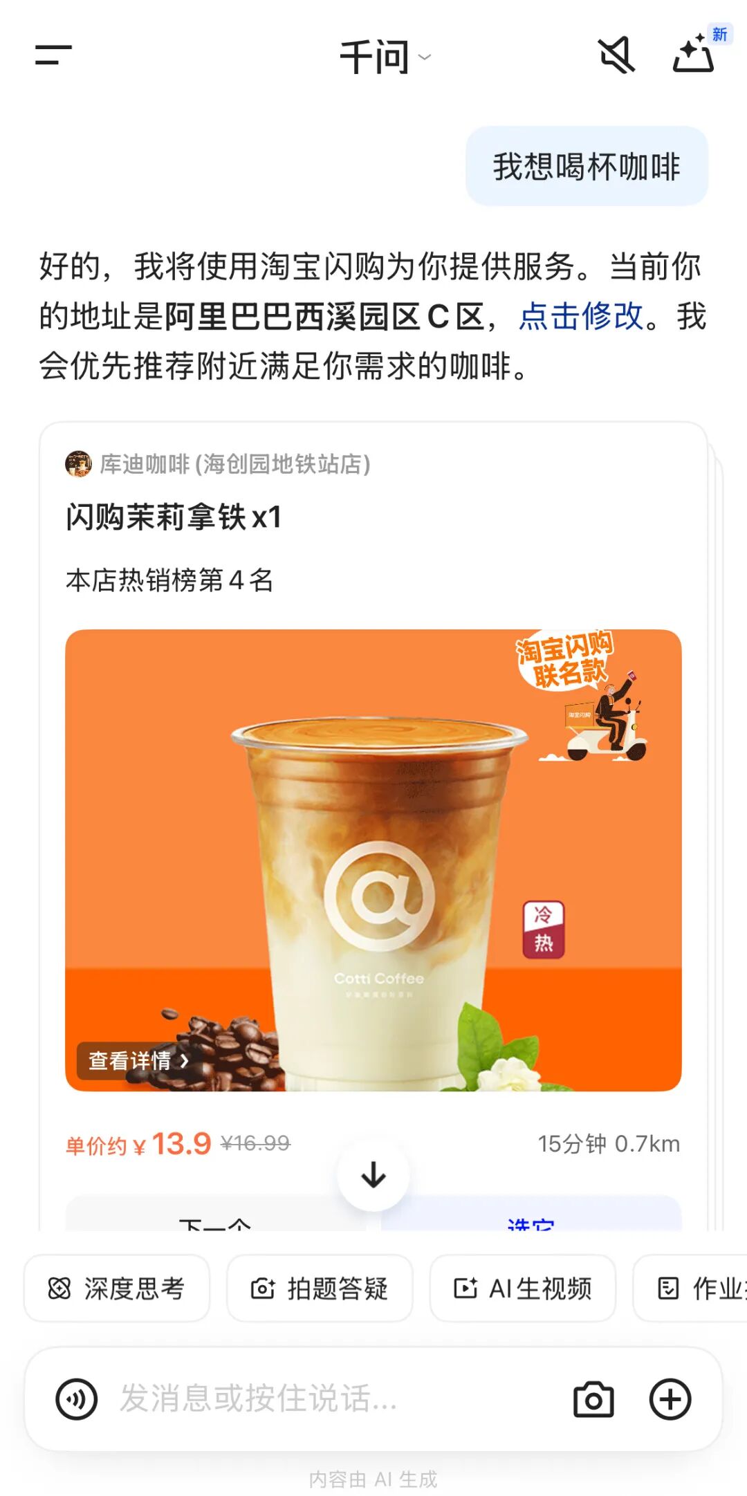 中午,又到了一天最容易犯困的时候,我想点一杯咖啡,直接在千问对话框输入需求,它通知我将通过淘宝闪购下单,绑定了淘宝闪购账号后,千问开始直接跳出商品卡片,推荐多种口味拿铁,卡片左键为“下一个”,右键为“选它”。