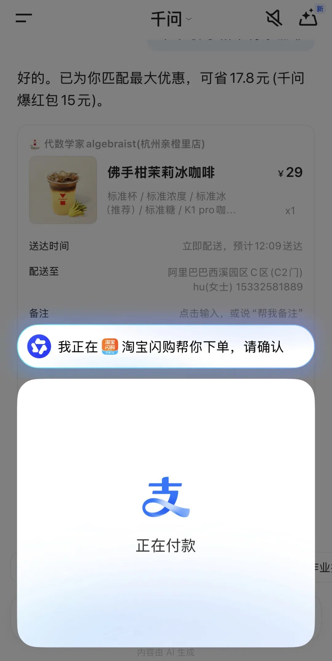 选中其中一款咖啡,直接支付宝付款(当然也要绑定一次支付宝),一次购物就这样完成了。各个链接之间的跳转非常顺滑,除了选项相对有限,几乎没有任何Bug。千问还给今天下单的几乎所有订单给发出15块红包。