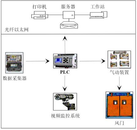 利用智能通风系统升级改造,矿井在原有的气动风门自动化控制基础上,结合矿井4G工业环网和PLC编程的远程控制技术,开发并投入使用首个矿井风门地面远程控制系统。适配的控制软件系统融合矿井监测监控系统,实现数据储存、数据查询、状态模拟、紧急呼叫等功能。增强矿井的抗灾消灾的快速反应能力,保障井下工作人员的生命安全,风门系统结构示意如图3所示。