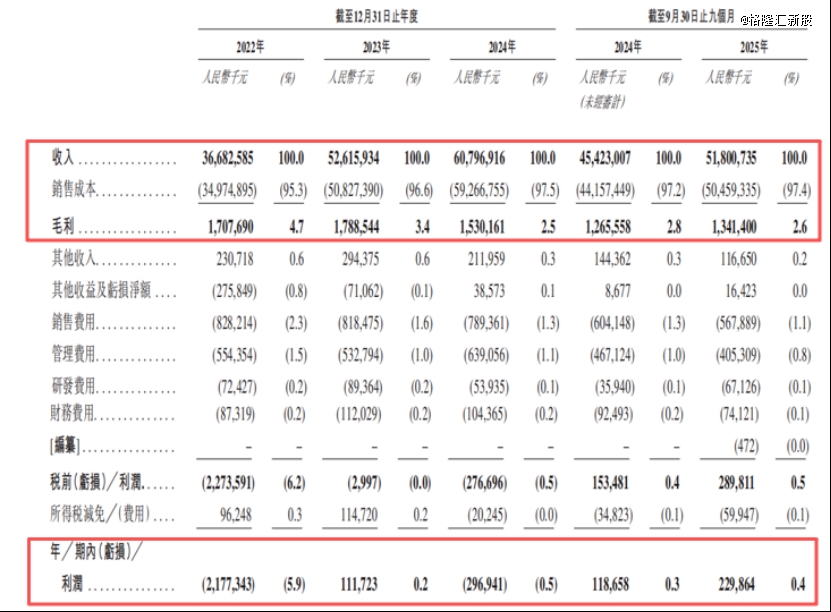毛利率不足5%,2022年及2024年净利润为负