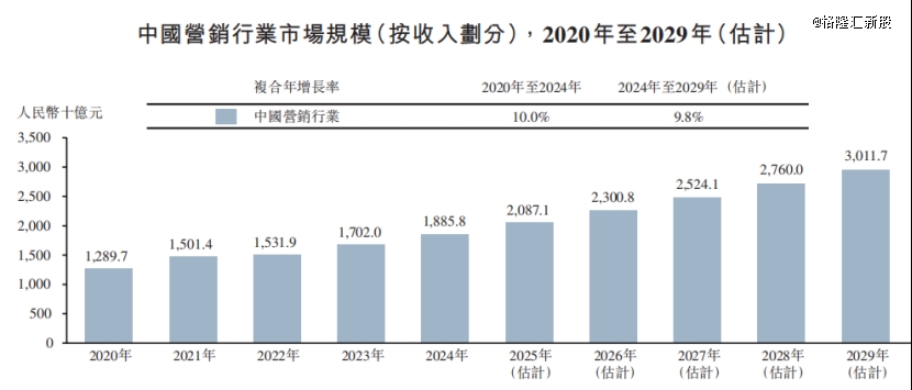 根据弗若斯特沙利文的资料,2024年,中国营销行业市场规模为1.89万亿元,预计2029年增至3万亿元,2024年至2029年的复合年增长率为9.8%。