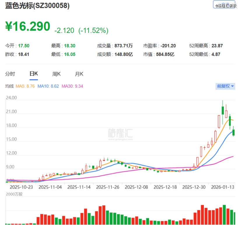 蓝色光标于2010年2月在深交所创业板上市,股票代码:300058.SZ。截至1月16日收盘,公司股价16.29元/股,市值584.8亿元,2026年涨幅41.41%;年初至本周二的最高点曾实现股价翻倍。