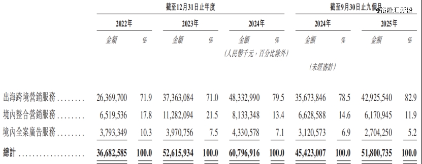 2025年1-9月,公司来自出海跨境营销服务的收入占比达82.9%,较2022年的71.9%大幅提升。