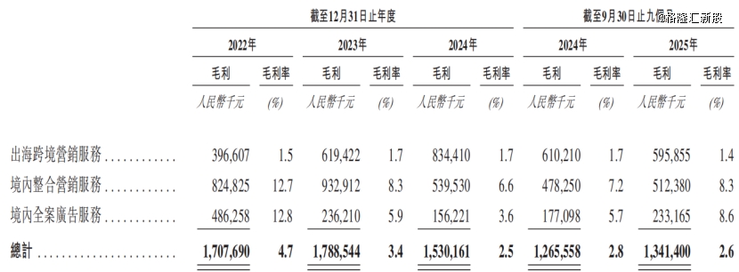 境内整合营销服务贡献的收入比重则由2022年的17.8%下降至2025年1-9月的11.9%。