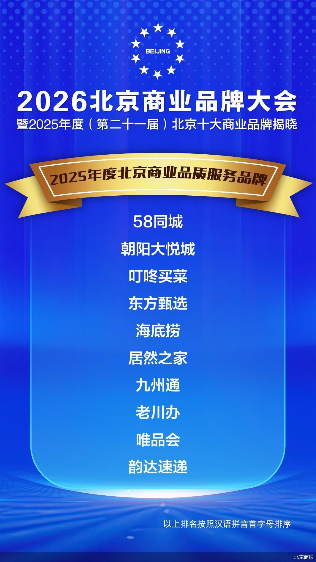 其中,58同城、朝阳大悦城、叮咚买菜、东方甄选、海底捞、居然之家、九州通、老川办、唯品会、韵达速递10家品牌荣膺“2025年度北京商业品质服务品牌”。该榜单旨在表彰年度商业品质服务水平最为卓越的品牌,同时代表了北京商业服务的“天花板”,使消费者享受到更加贴心优质的服务,同时也为更多品牌提供了品质服务的“教科书”。