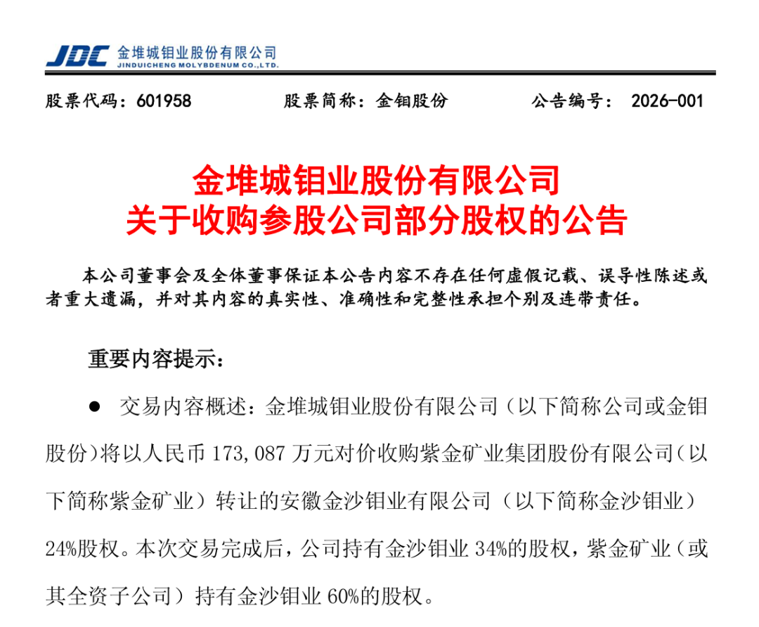 1月16日,金堆城钼业股份有限公司(下文简称“金钼股份”,601958.SH)发布公告称,公司将以17.31亿元对价收购紫金矿业集团股份有限公司(下文简称“紫金矿业”)转让的安徽金沙钼业有限公司(下文简称“金沙钼业”)24%股权。