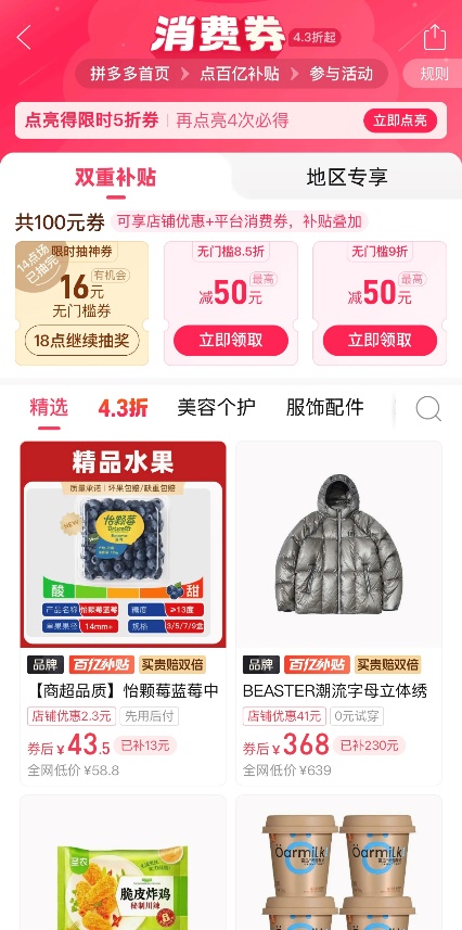 ▲从拼多多首页进入百亿补贴,分别点击加倍补专区、消费券专区即可参与活动。