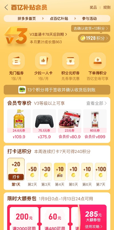 结合年货消费数量多、频次高等特点,拼多多百亿补贴会员积分同样覆盖此次“年货节”活动,使用积分可兑换多面额消费券,68元升级V3会员即可不定时免费领取至高700元大额券包,享6个月无门槛20元券等活动,助力消费者无忧购年货,尽享折上折。