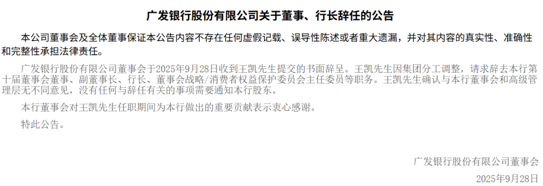 图/广发银行原行长王凯辞任公告(来源:广发银行官网)