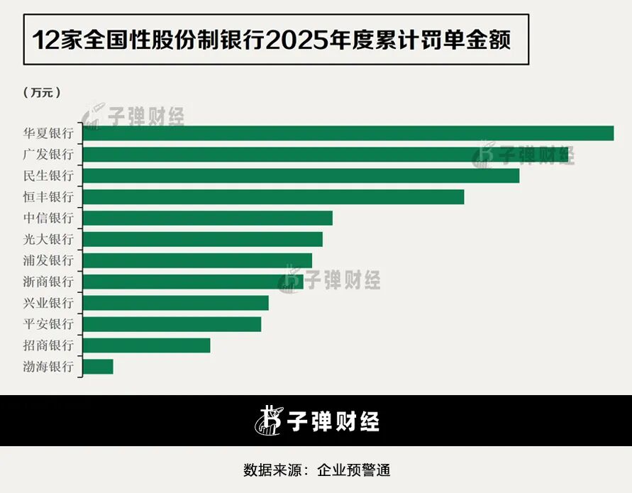 根据企业预警通披露的数据,在12家全国性股份行之中,广发银行在2025年全年的累计罚单金额达到10970.2万元,仅次于华夏银行的12080.93万元。