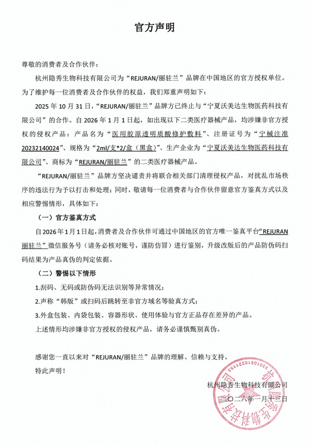 自2026年1月1日起,如出现产品名为“医用胶原透明质酸修护敷料”、注册证号为“宁械注准20232140024”、规格为“2ml/支*2/盒(黑盒)”、生产企业为“宁夏沃美达生物医药科技有限公司”、商标为“REJURAN/丽驻兰”的二类医疗器械产品,均涉嫌非官方授权的侵权产品。