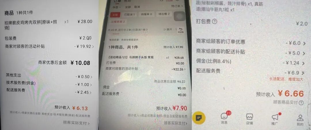 山东一家快餐店老板吐槽,标价28元一份的脆皮鸡烤肉双拼饭,商家的活动补贴19.92元,再扣除包装费、配送费,佣金等,到手才6.13元;浙江一家小吃店,28元的马蹄狮子头饭,商家补贴22.26元,预计收入7.9元……