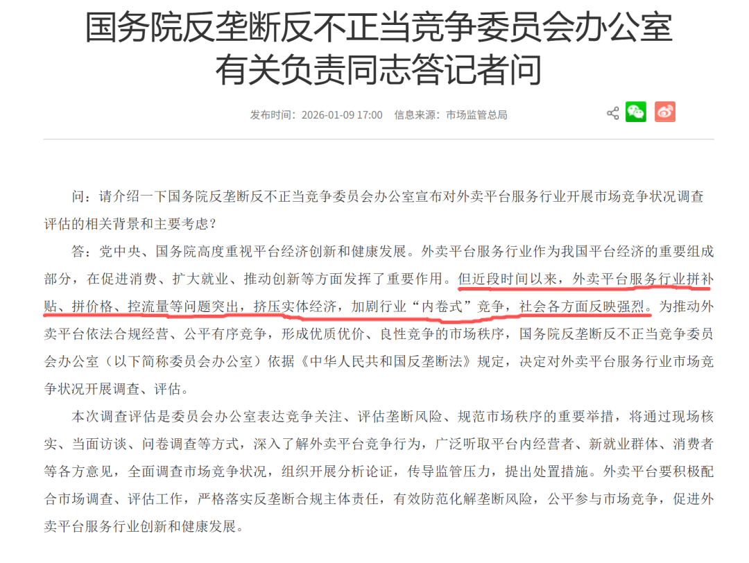 2026年1月9日,国务院反垄断反不正当竞争委员会办公室正式宣布,将对外卖平台服务行业市场竞争状况开展全面调查评估。