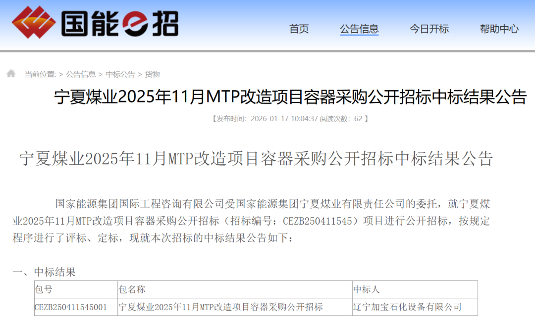 【中标】118 亿 宁夏煤业MTP改造项目中标