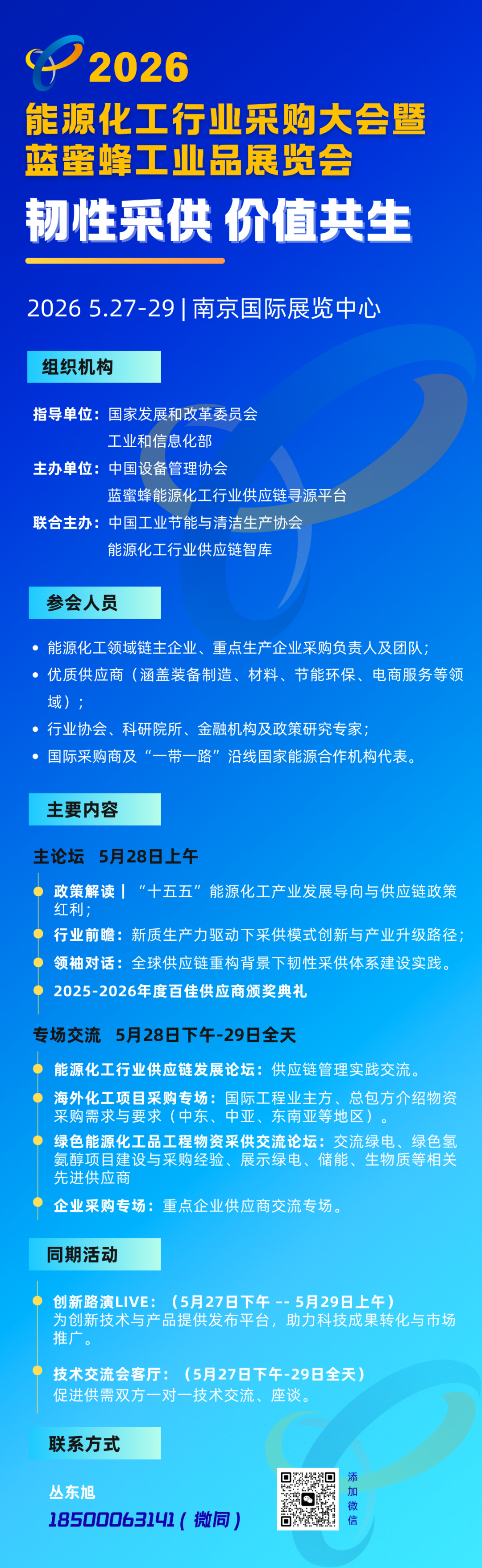为贯彻“十五五”规划关于产业链供应链自主可控、绿色低碳转型的核心要求,搭建能源化工行业高效采供对接平台,提升产业链韧性与安全水平,助力新质生产力赋能产业高质量发展,蓝蜜蜂能源化工行业供应链寻源平台将于2026年5月27—29日在南京国际展览中心举办2026能源化工行业采购大会,同期举办蓝蜜蜂工业品展览会。
