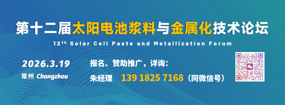 第十二届太阳电池浆料与金属化技术论坛将于2026年3月19日在江苏常州召开。会议将探讨光伏行业展望与浆料市场前景,异质结、TOPCon和XBC电池技术与金属化工艺,LECO激光设备与先进银浆,激光转印、全开口钢版、铜浆、银包铜、铝浆、铜电镀、无主栅技术与应用,光伏电池金属化导电机理与接触机制,晶硅-钙钛矿叠层电池金属化工艺与浆料技术展望等。
