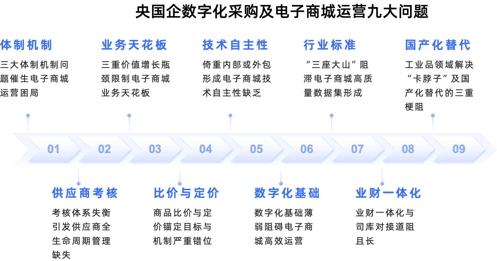 为系统梳理行业实践痛点、沉淀创新解决方案、提炼标杆案例经验,亿邦智库启动“央国企采购电子商城发展现状、挑战与未来趋势”年终专题研究。研究过程中,研究团队深度访谈了中航工业、国家能源集团、中国移动、中国宝武、中盐集团、中交建、中广核、陕建物流、陕煤物资、河钢供应链等十余家央国企的采购与供应链部门负责人,通过一手调研与实证分析,精准总结出当前央国企电子商城运营面临的九大核心问题: