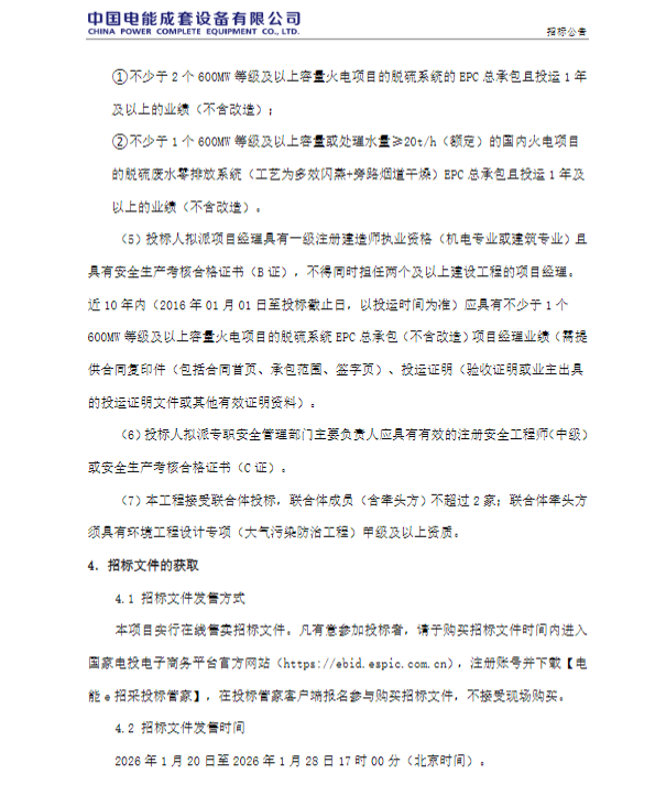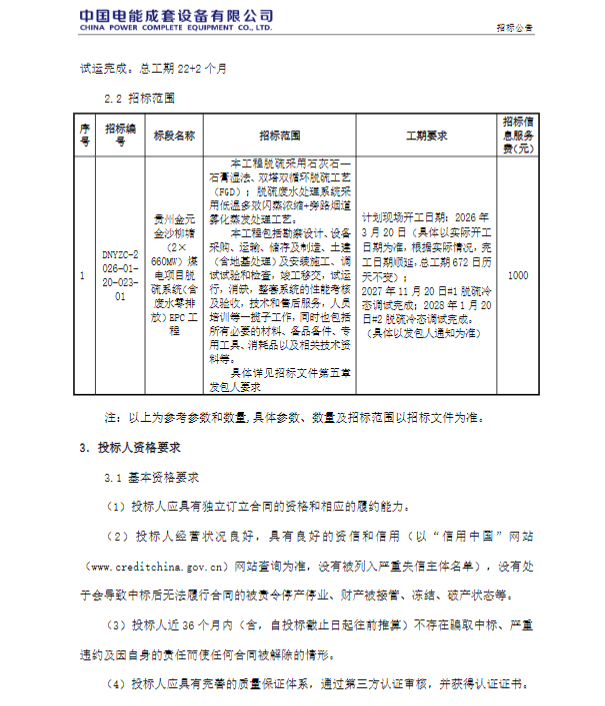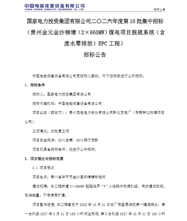 1月20日,中国电力设备信息网国家电投电子商务平台发布国家电力投资集团有限公司二〇二六年度第10批集中招标(贵州金元金沙柳塘(2×660MW)煤电项目脱硫系统(含废水零排放)EPC工程)招标公告,详情如下: