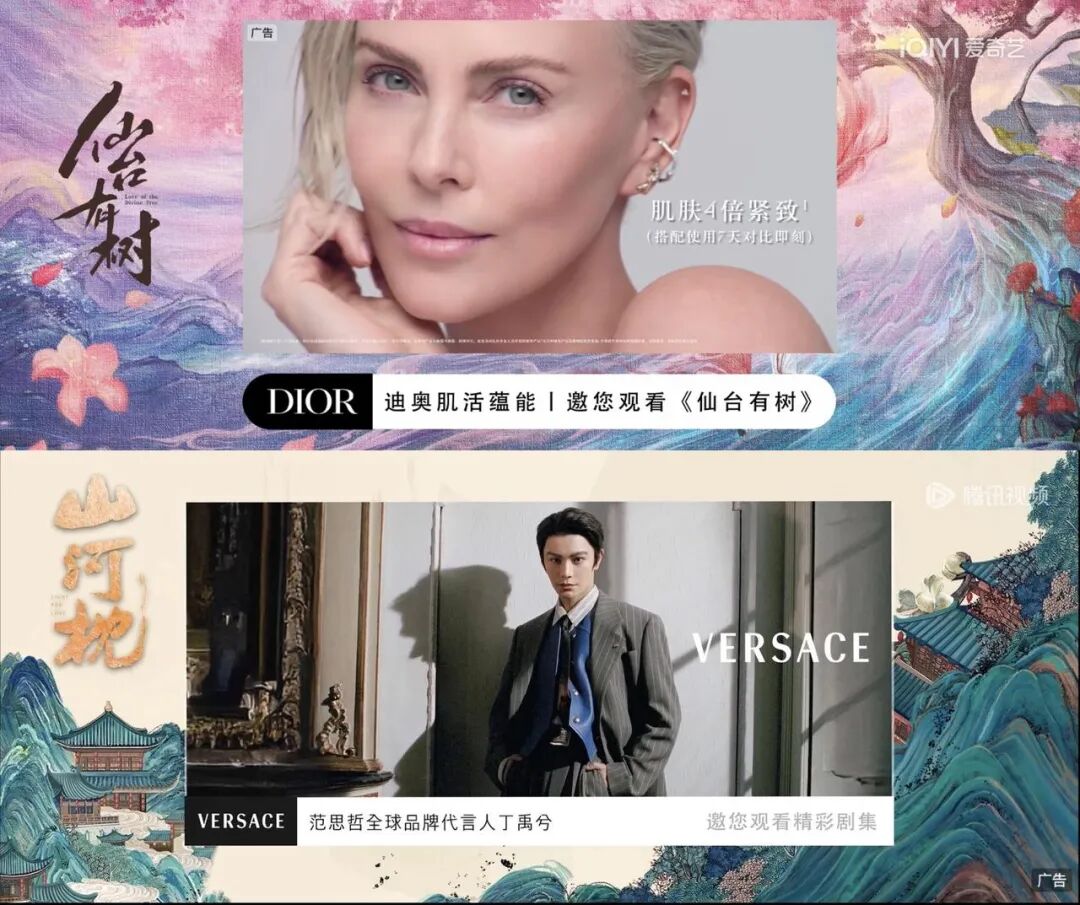 一种常见方式,是品牌直接投放自家代言人参与的剧综。这种策略过去也存在,但今年的不同之处在于,一些此前很少出现在剧综广告中的奢侈品牌,也开始采用这一方式。例如,迪奥在护肤系列代言人邓为首次担任男主的剧集《仙台有树》中进行投放,范思哲则投放了全球品牌代言人丁禹兮主演的《山河枕》。