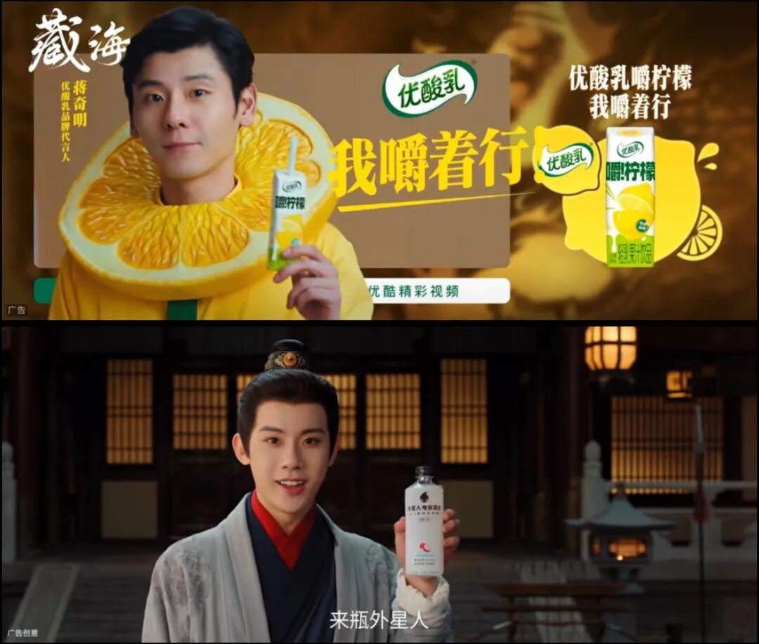 还有元气森林旗下的外星人电解质水,品牌投放《蛮好的人生》《书卷一梦》《藏海传》等多部剧,以主演角色搭配“魔性”BGM的中插广告反复洗脑。