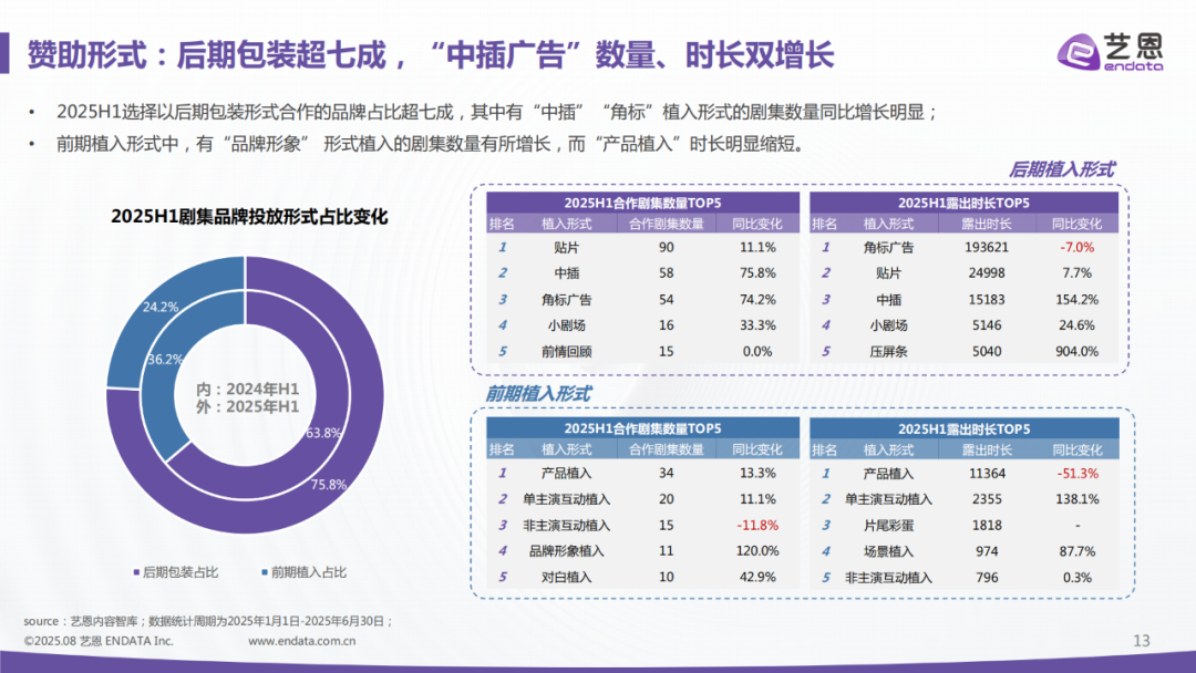 现在,软植入就显得不那么灵活了,其制作时间周期长,调整空间小,想要快速增减很难实现。所以相应地,可后期包装、可随时增减的中插广告和硬广占比持续提升。据艺恩数据发布报告显示,2025年上半年选择后期包装的品牌占超70%,中插广告在数量和时长上都有所增长。