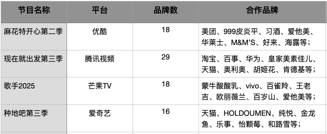比如据软广通(击壤旗下产品)统计,优酷的《麻花特开心2》总植入品牌有18个,爱奇艺的《一路繁花第二季》和《种地吧3》均达到16个,腾讯视频的《现在就出发第三季》汇聚了 29个品牌,芒果TV的《歌手2025》也斩获18个品牌。这些综艺有成熟且忠实的观众,已经形成了很长的情绪陪伴周期,对品牌而言这就意味着投放会有更确定可预期的回报。