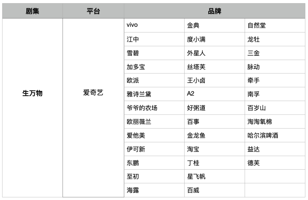 爱奇艺的《生万物》改编自获奖文学作品,由杨幂和多位老戏骨主演,在热播期收获近40个品牌合作,且收官后仍有品牌追加。
