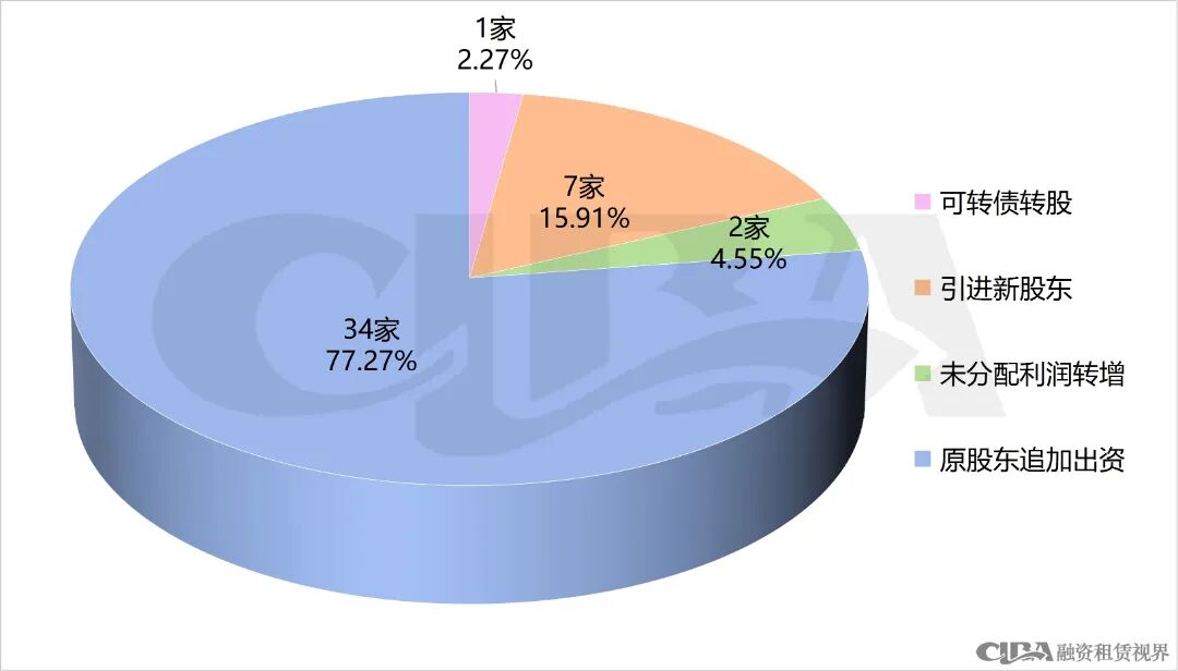 从增资方式来看,上述44家融资租赁企业的主要增资方式包括原股东追加出资、未分配利润转增注册资本、引进新股东,以及可转债转股。其中,34家融资租赁企业通过原股东追加出资的方式进行增资,占企业总数的77.27%。