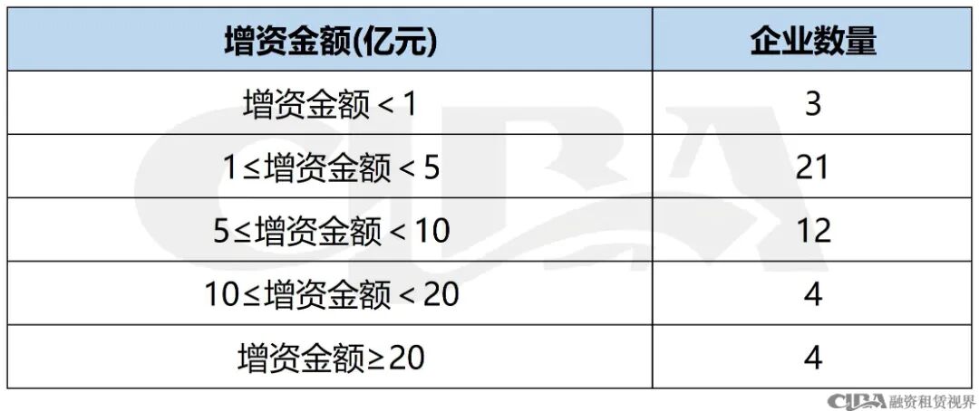 中信金融租赁有限公司、华夏金融租赁有限公司、浙江浙商融资租赁有限公司等3家融资租赁企业的增资金额突破20亿元,分别增资60亿元、30亿元、23.50亿元。