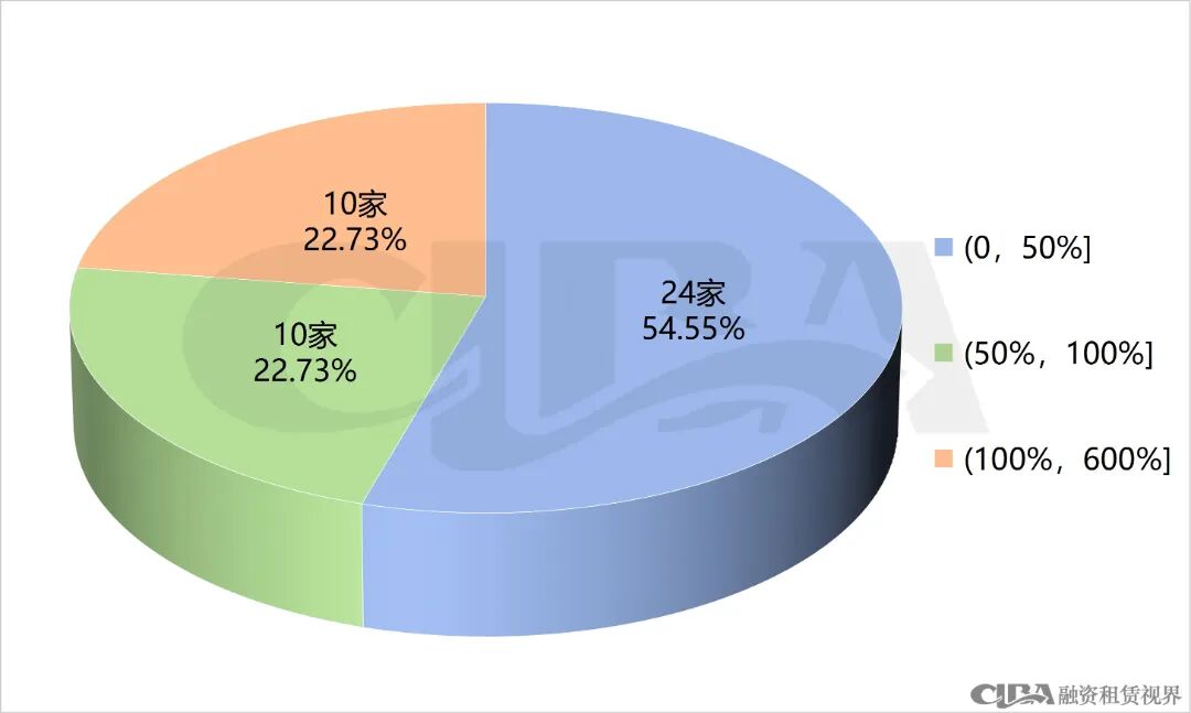 从增资幅度来看,超过一半的融资租赁企业位于(0,50%]这一区间,有10家企业的注册资本增幅超过100%,实现翻倍增长,分别是无锡联投融资租赁有限公司、杭州和达融资租赁有限公司、浙江文投融资租赁有限公司、上海小米融资租赁有限公司、中集鑫德融资租赁(天津)有限公司、中信金融租赁有限公司、武汉融资租赁有限公司、浙江浙商融资租赁有限公司、中航材(北京)融资租赁有限责任公司与天下达融资租赁(厦门)有限公司。
