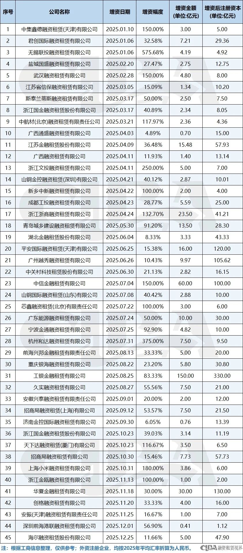 44家企业459亿元!2025年融资租赁行业增资规模跃升