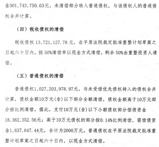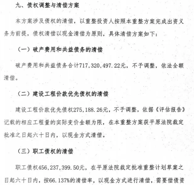 草案指出,重整投资人将投资10.5亿元,承接阳煤平原全部资产,并按重整计划清偿破产费用和共益债务(含土壤修复费6.17亿元)、建设工程价款优先债权、职工债权、税收债权、普通债权等。
