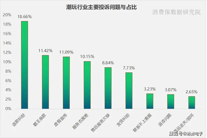 潮玩行业的用户投诉呈现出明显的集中化特征,退款纠纷(18.66%)、霸王条款(11.42%)、虚假宣传(11.09%)是当前潮玩消费投诉中最突出的三大问题,合计占比超41%。