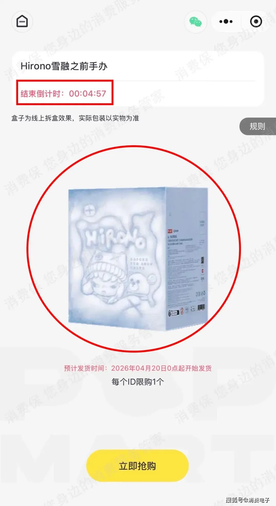 从消费者提供的抢购页面截图可以看到,正中央仅显示盒面,没有手办样品图,上方又用标红字体进行倒计时,抢购的紧迫感使得消费者无法谨慎判断是否为自己订阅关注的商品。