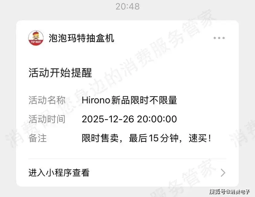 2025年12月26日晚,吴女士在微信收到来自“泡泡玛特抽盒机”小程序的订阅消息,标题为“活动开始提醒”,下方还备注“限时活动,最后15分钟,速卖!”