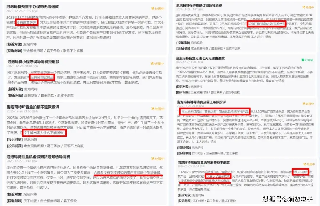 消费者认为,这是泡泡玛特利用盲盒爱好者的抢购心理做出的误导营销,再用“在线拆玩法不退不换”的霸王条款阻碍其正常维权。目前,消费者的诉求是立即退款。