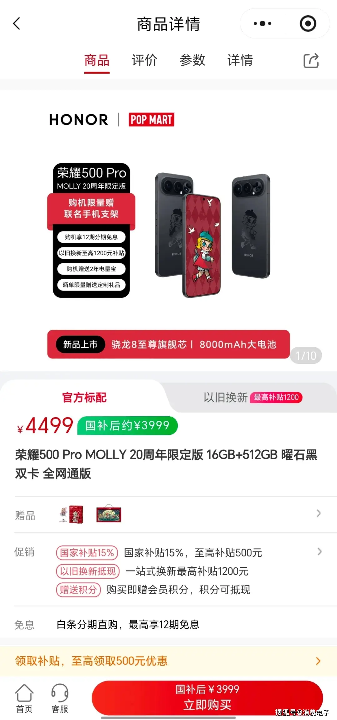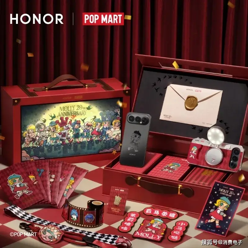 1月19日,荣耀与泡泡玛特合作推出的“荣耀500 Pro MOLLY 20周年限定版”手机正式发布,售价4499元,国补后到手价3999元,将于1月25日上午10时08分正式开售。