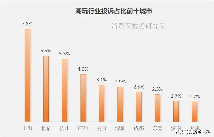 潮玩行业的投诉用户主要集中在一线城市和新一线城市。投诉占比排行前三的城市分别为上海(7.8%)、北京(5.5%)和杭州(5.3%)。