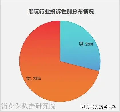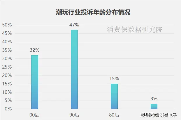 潮玩行业的投诉用户群体以女性为主,占比高达71%,远超男性用户的29%,显示出其产品在女性消费者中更具吸引力。从年龄分布来看,90后是主要消费群体,占比47%,00后紧随其后,占比32%,表明潮玩行业深受年轻一代的喜爱。