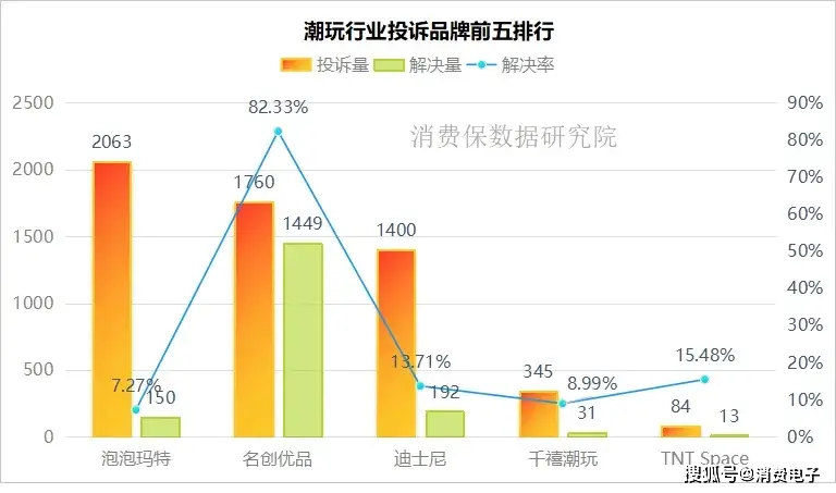 据消费保平台数据,潮玩品牌中,泡泡玛特的投诉量最高,为2063件,但解决率仅7.27%;名创优品紧随其后,投诉量1760件,而解决率在业内领先,为82.33%。