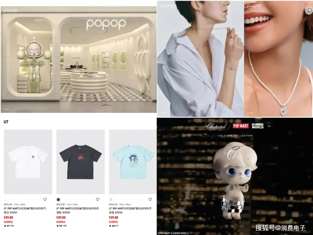 近几年,泡泡玛特在跨界合作上动作频繁,接连推出《英雄联盟》《哪吒2》等知名游戏影视IP盲盒;2025年,自营珠宝品牌POPOP门店先后进驻上海、北京等地,BabyMolly金饰系列价格比肩老铺黄金;8月29日,与优衣库联合推出THE MONSTERS 主题UT;同期,还与瑞士奢华珠宝与腕表品牌Chopard萧邦合作,打造限量版“光影”联名礼盒套装,含18K金项链和定制公仔,售价25199元。潮玩正在加速渗透高端零售与时尚圈层。此外,还有传言称泡泡玛特将入局AI玩具、家电领域。