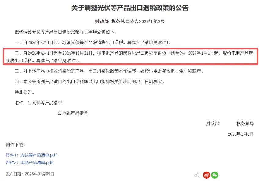 此外2026年1月,财政部、税务总局发布公告,自2026年4月1日起,储能电池出口退税率从9%下调至6%,2027年1月1日起彻底取消退税。