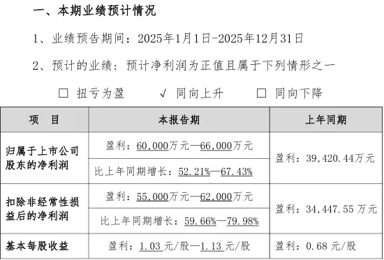 预计全年实现归属于上市公司股东的净利润6亿元至6.6亿元,同比增长52.21%至67.43%;扣非净利润预计为5.5亿元至6.2亿元,同比增幅达到59.66%至79.98%。