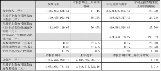 财报数据显示,公司财报数据显示,2025年第三季度,公司实现营业收入14.46亿元,同比增长41.71%,归母净利润1.9亿元,同比增长38.36%。