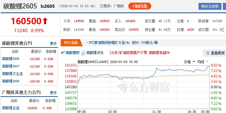 首先摆在企业面前的,是持续上升的成本压力。1月20日,广期所碳酸锂主力合约盘中快速拉升,收盘时触及涨停,报16.05万元/吨,现涨幅为8.99%。六氟磷酸锂、VC添加剂等电解液材料价格也持续攀升。成本曲线的抬升,正在迅速吞噬中下游企业本就不算充裕的利润空间。
